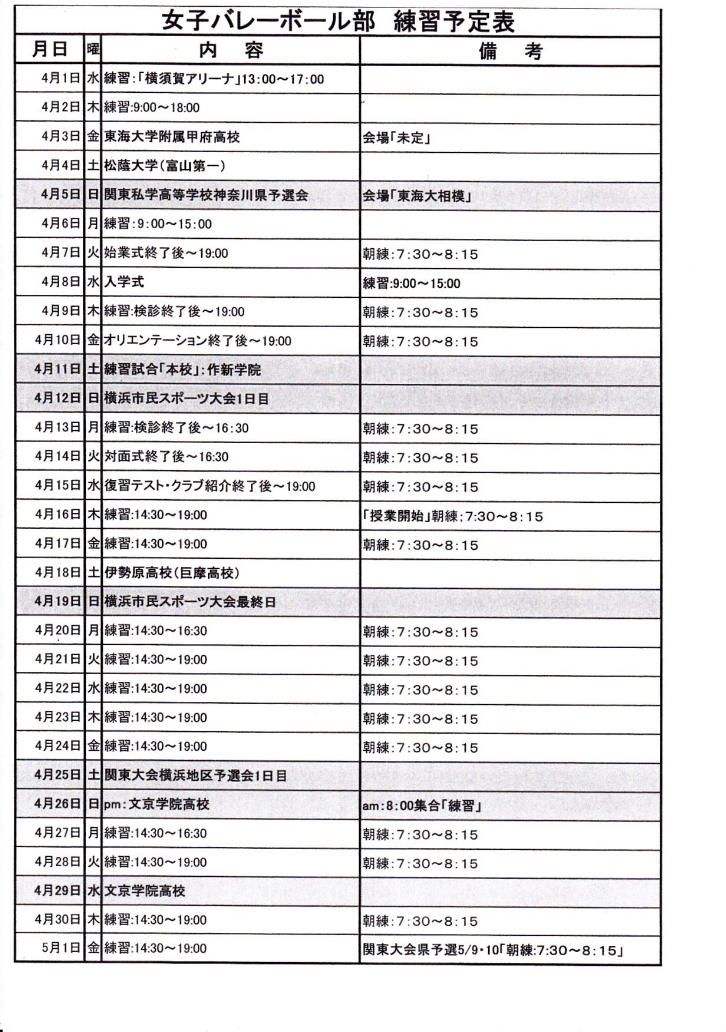 4月練習予定表
